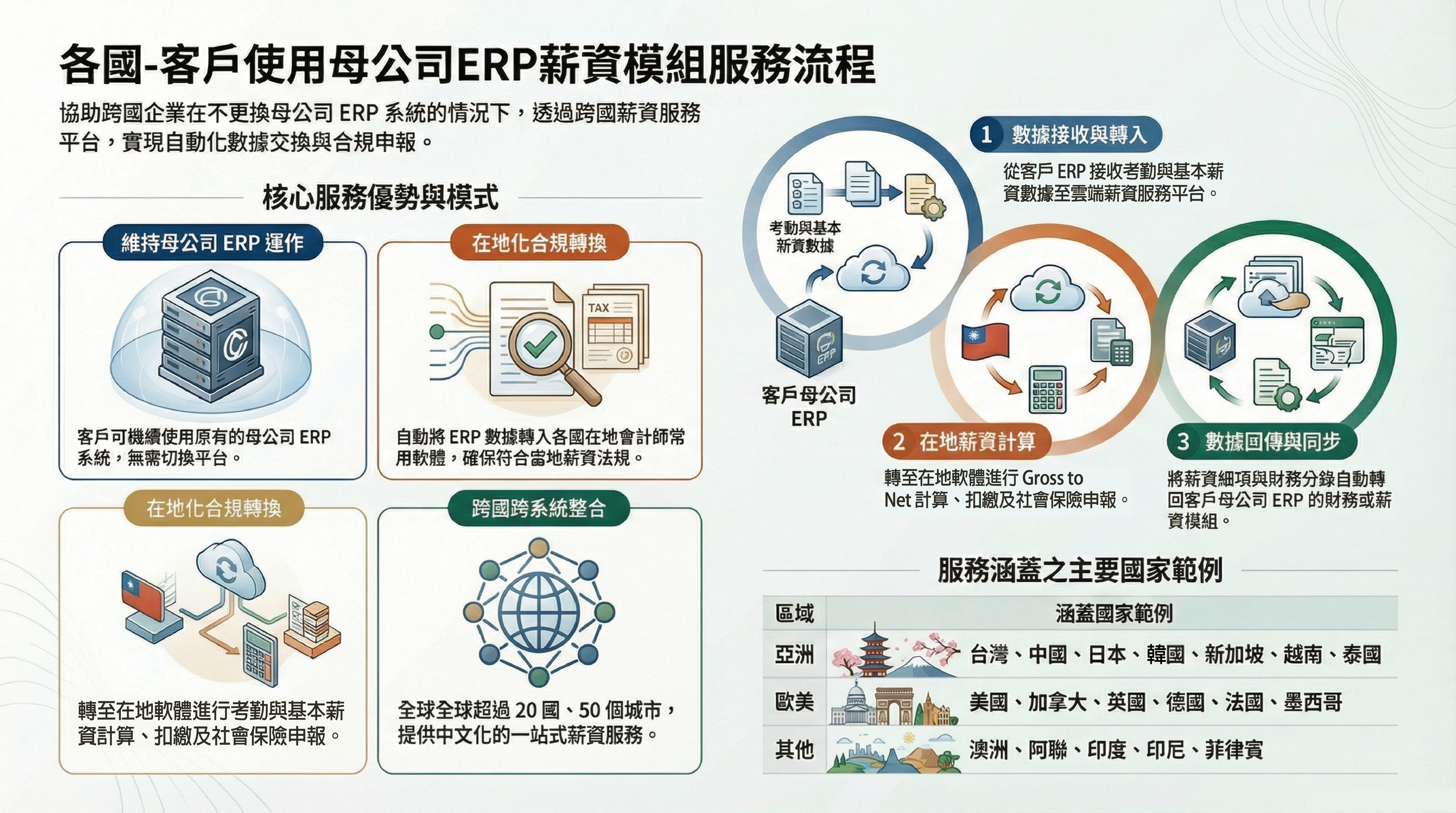 各國連結網頁–客戶使用母公司ERP薪資模組的服務模式