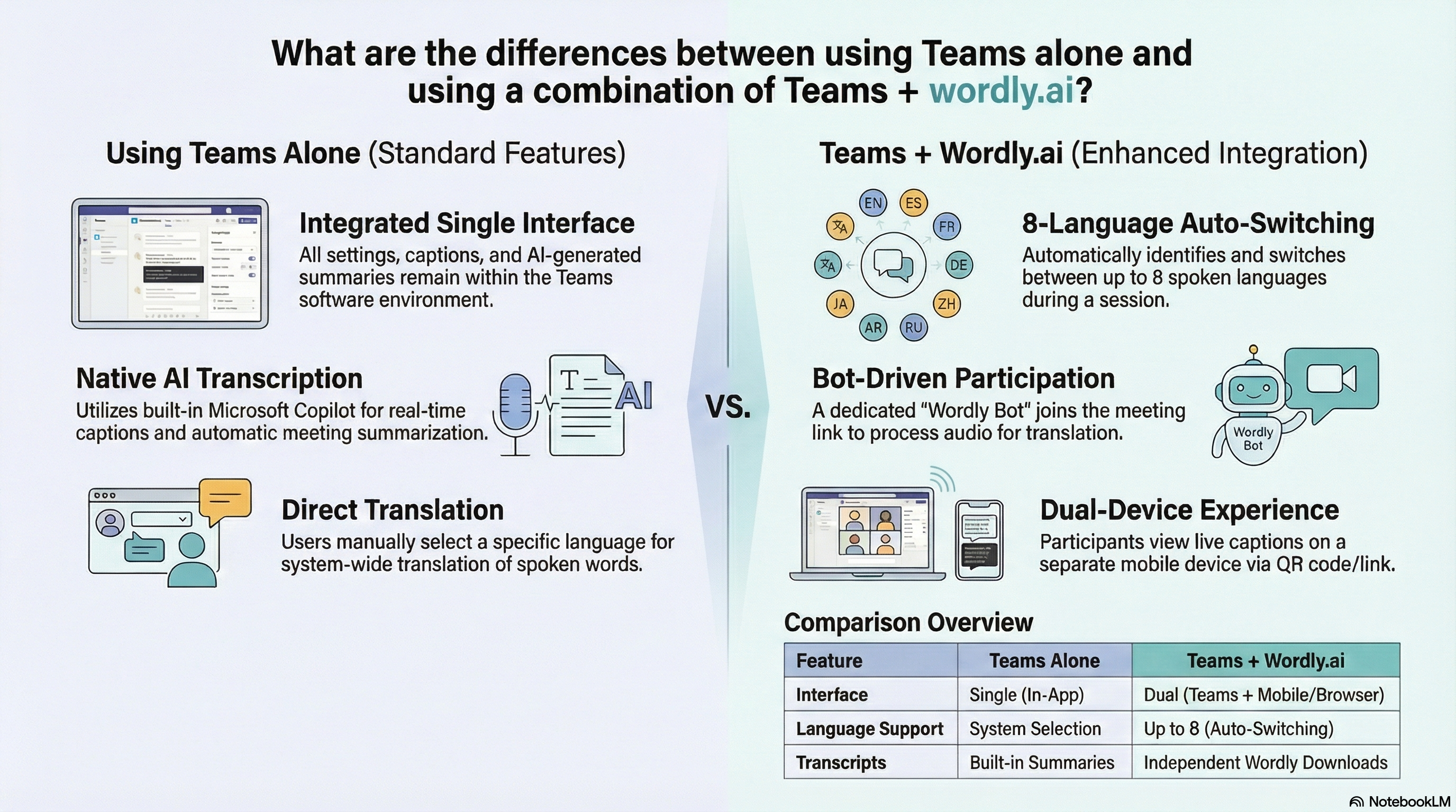 What are the differences between using Teams alone and using a combination of Teams + wordly.ai?