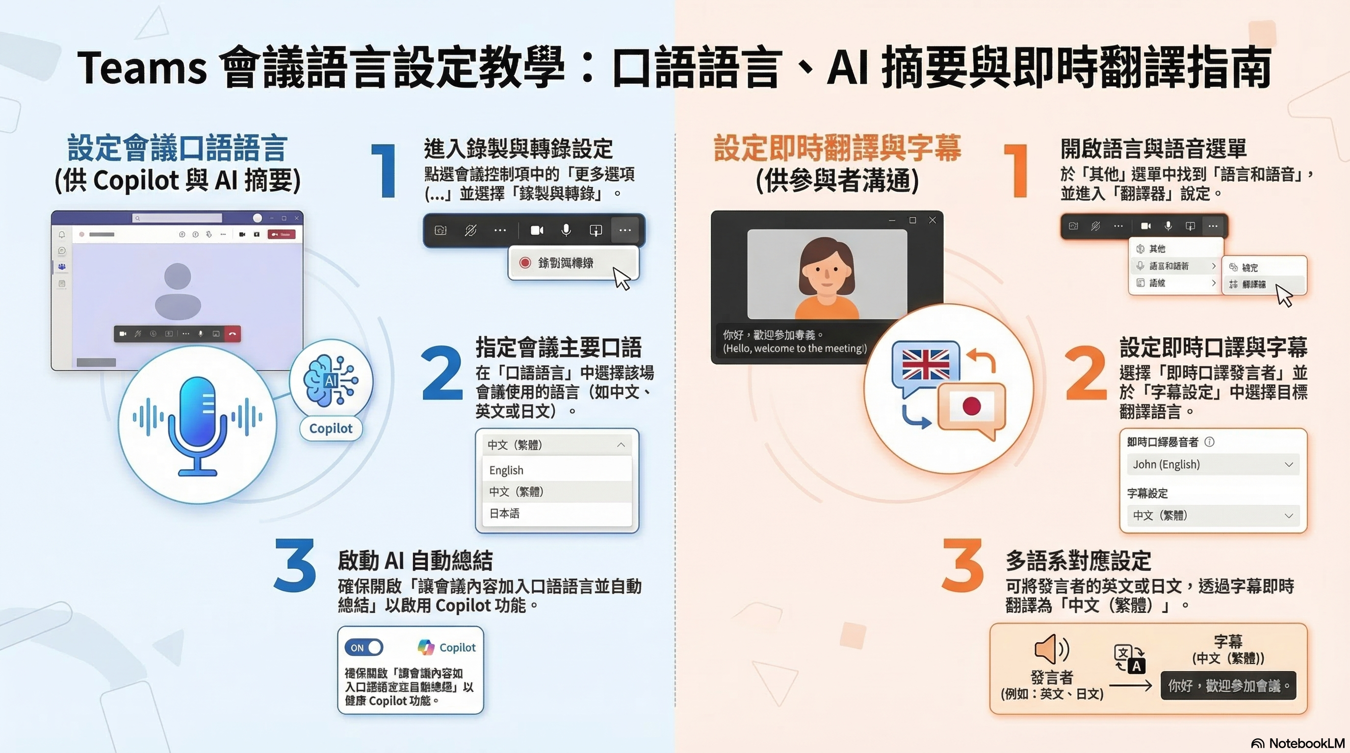 **控制項 >> 會議視窗「更多選項」>> 錄製與轉錄 >> 讓會議加入口語語言(例如英文)>> Copilot 和其他 AI >> 讓會議內容加入口語語言並自動總結